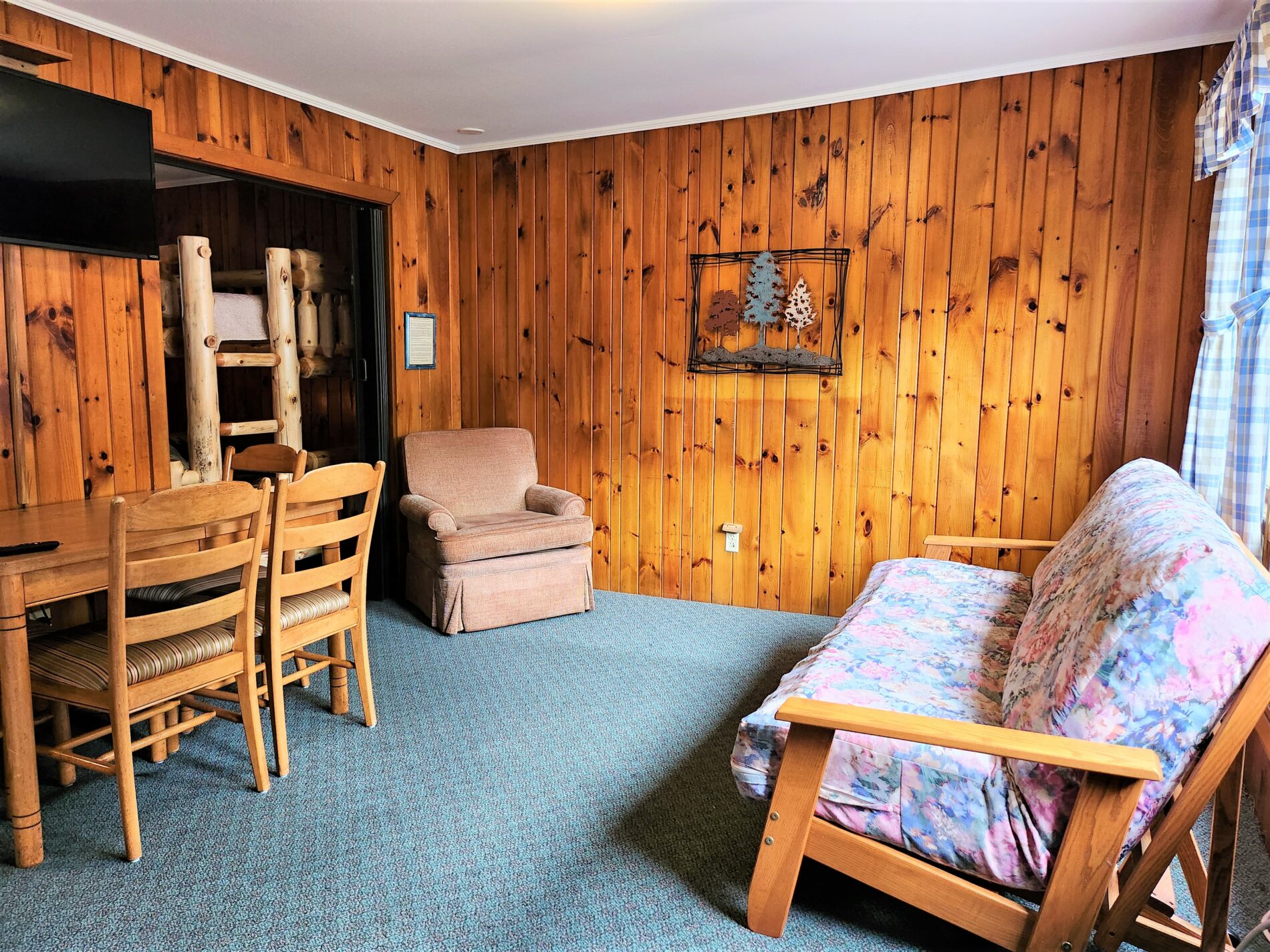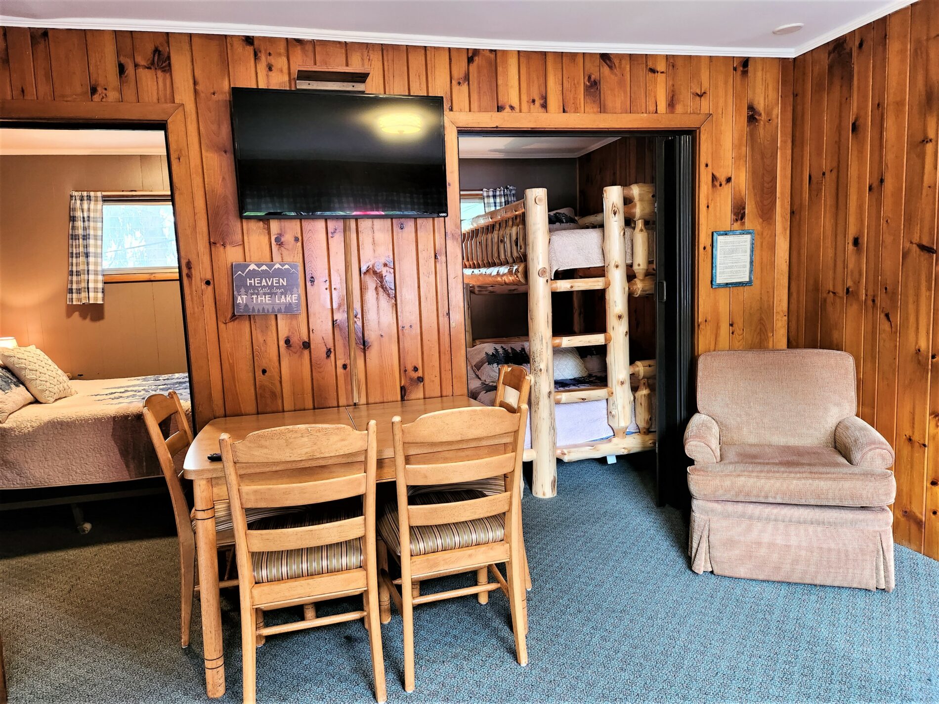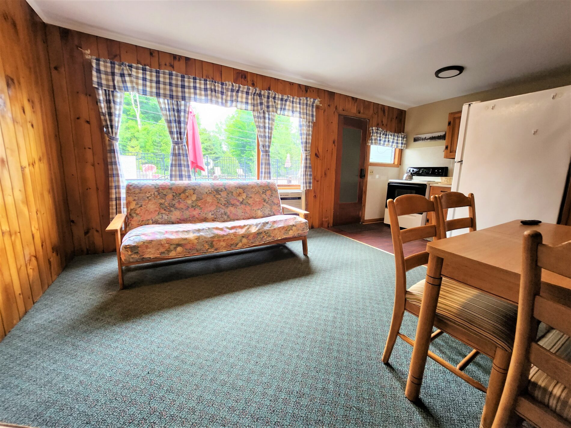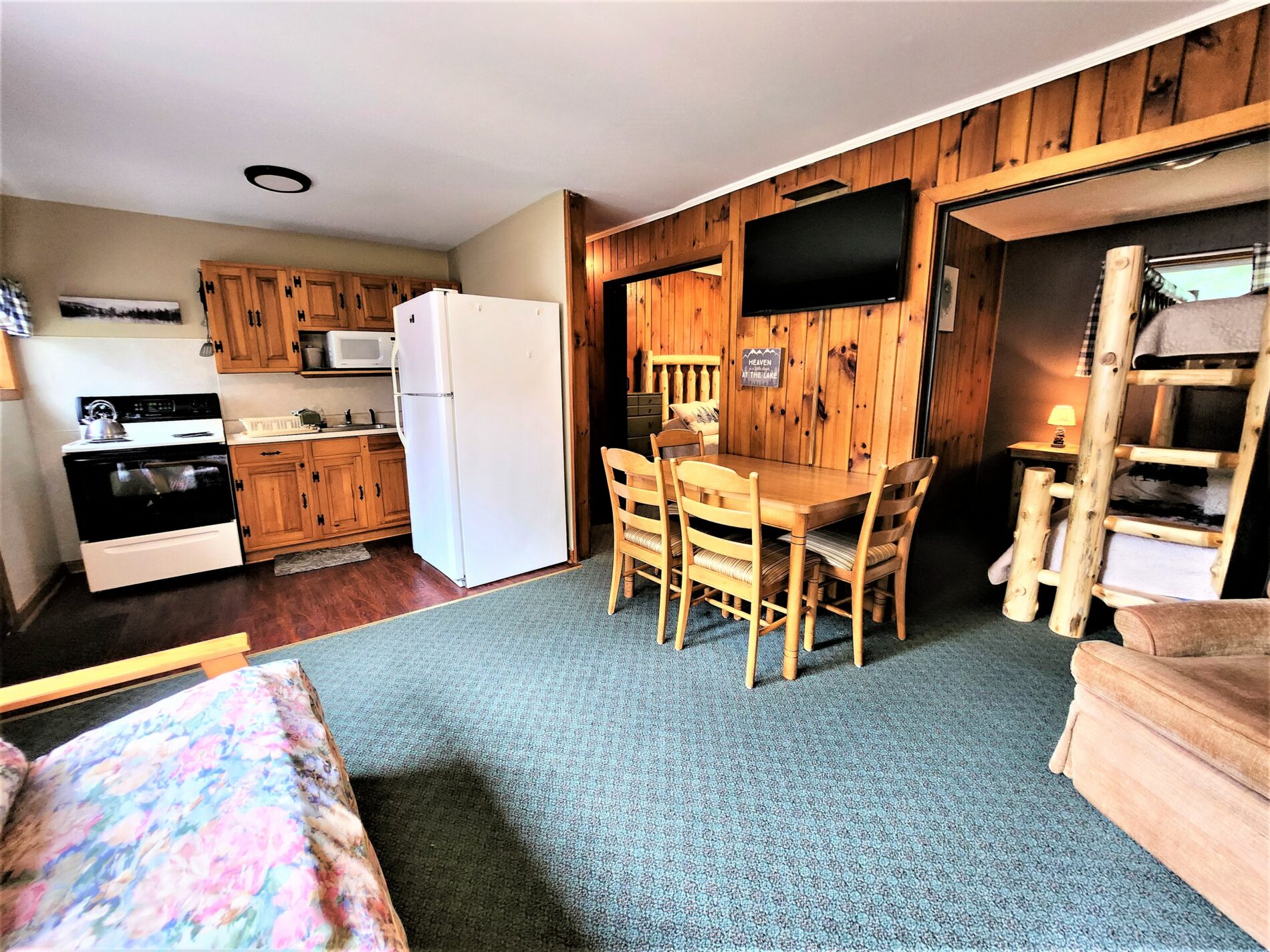 Our most popular duplex two-bedroom, cabin style suite overlooking the north pool that shares a porch with Studio Cottage 18. This Cabin Style Suite has two bedrooms , one with a double bed, the other with a twin over full bunk bed set. The bathroom has a full sized tub with shower. The living room has a futon couch, dining table, sitting area and TV. Full kitchen with a large refrigerator, stove with oven, microwave, and coffee maker. This cabin in Lake George, New York has a sundeck with patio set and grill. This may also be reserved with Studio 18 for groups and families.