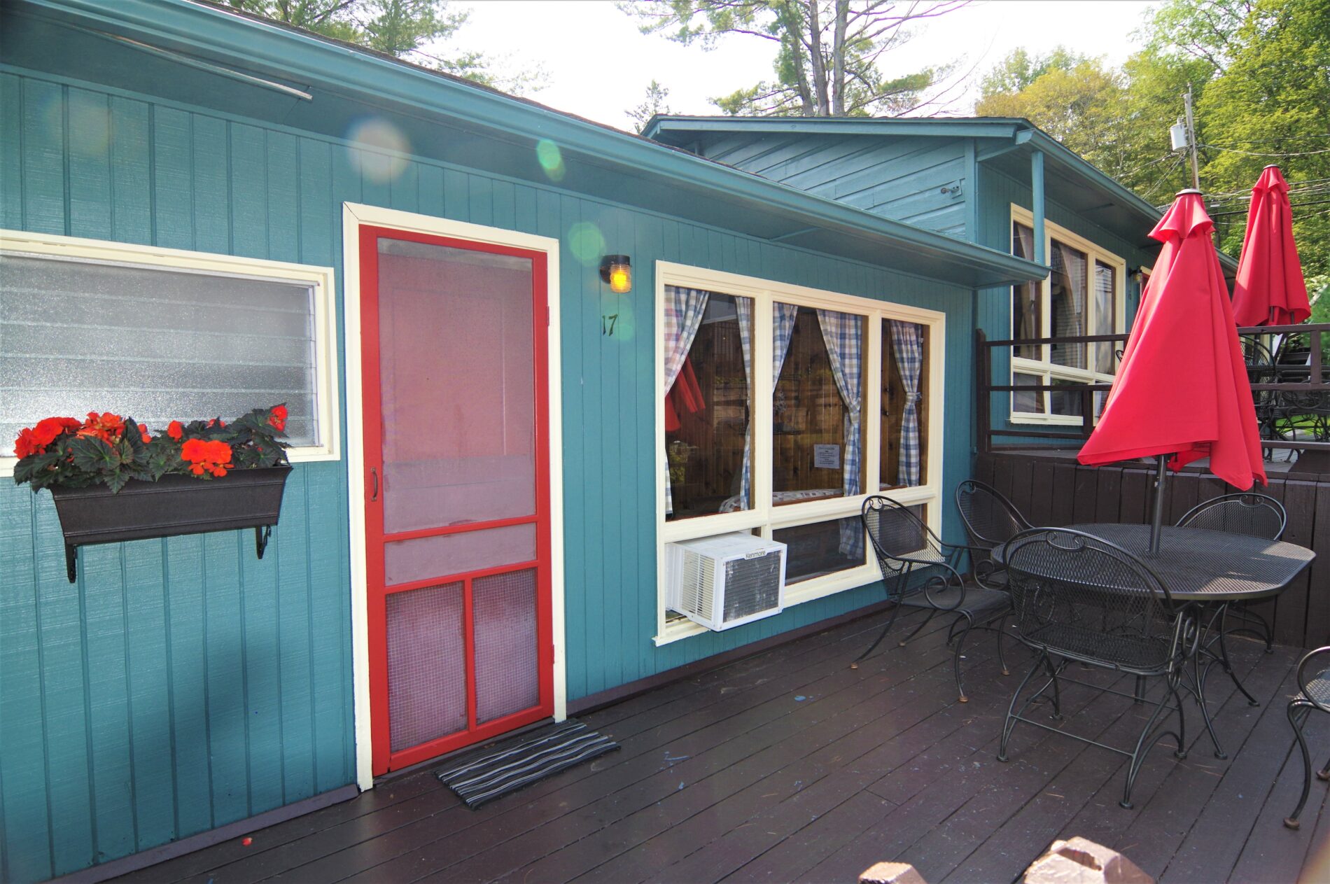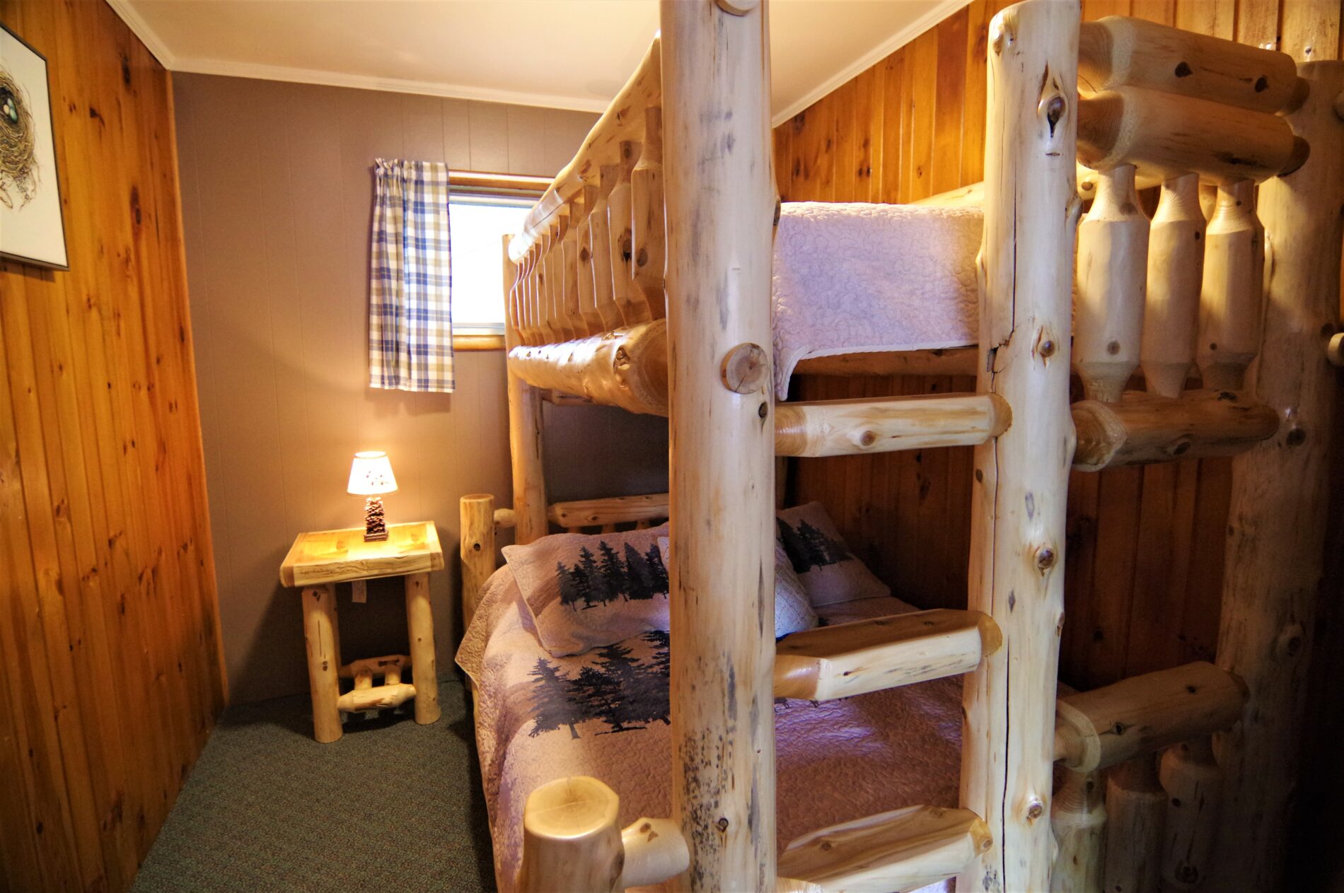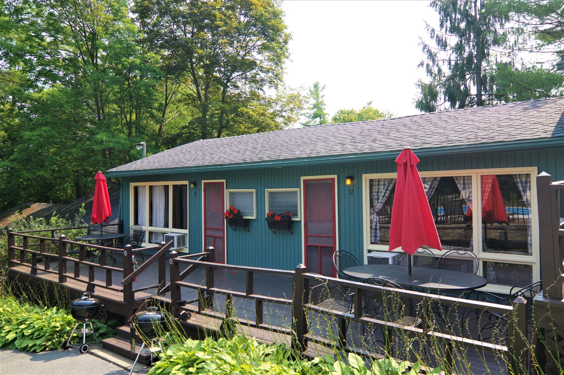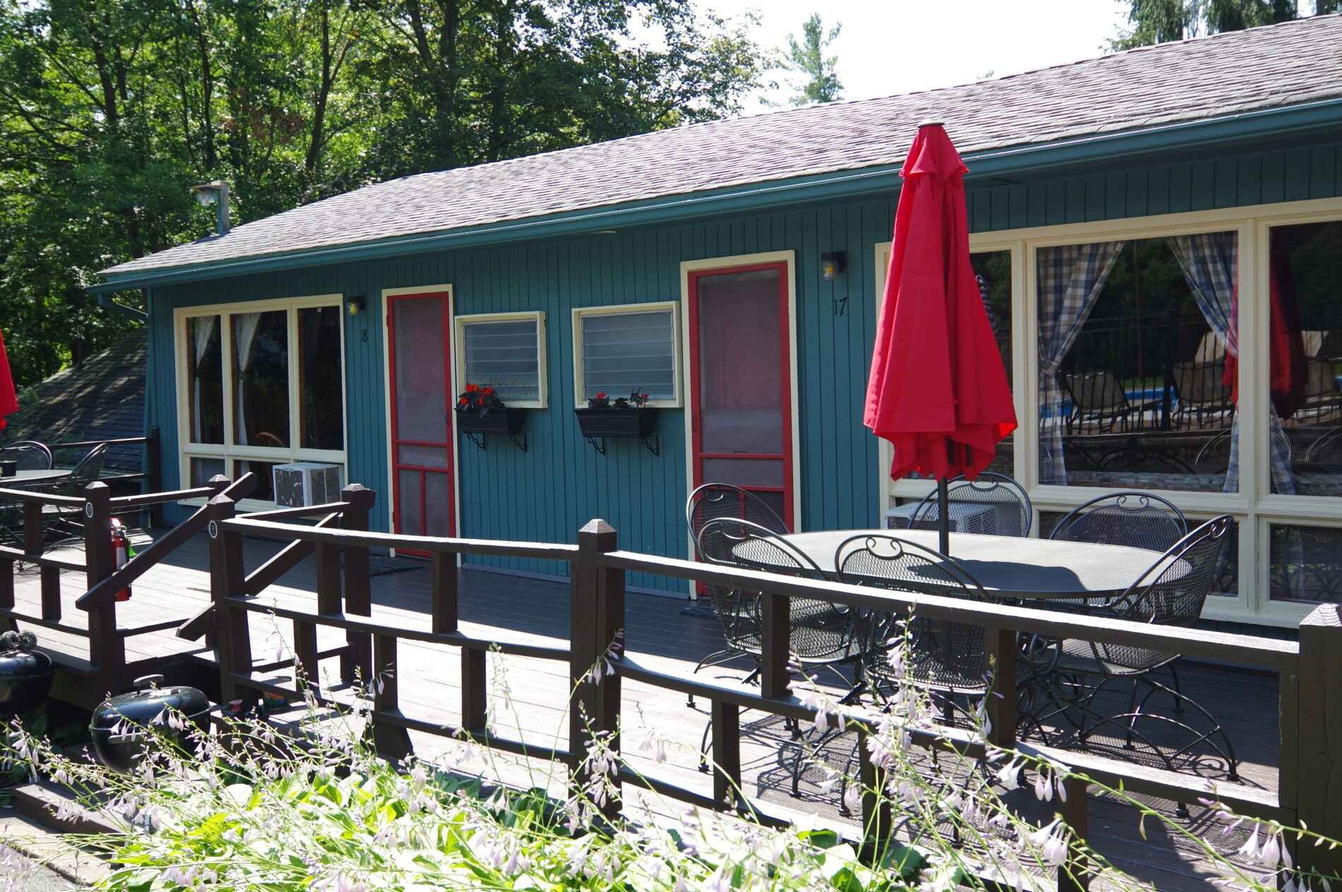 Our most popular duplex two-bedroom, cabin style suite overlooking the north pool that shares a porch with Studio Cottage 18. This Cabin Style Suite has two bedrooms , one with a double bed, the other with a twin over full bunk bed set. The bathroom has a full sized tub with shower. The living room has a futon couch, dining table, sitting area and TV. Full kitchen with a large refrigerator, stove with oven, microwave, and coffee maker. This cabin in Lake George, New York has a sundeck with patio set and grill. This may also be reserved with Studio 18 for groups and families.