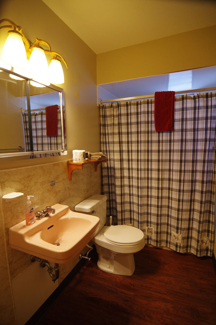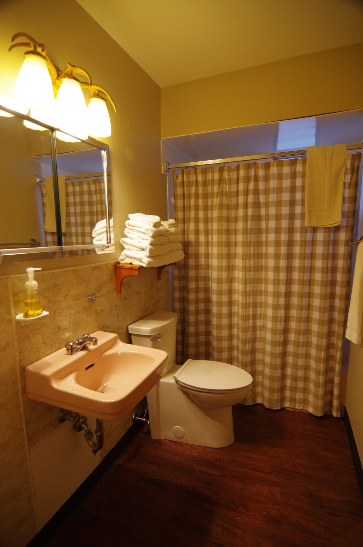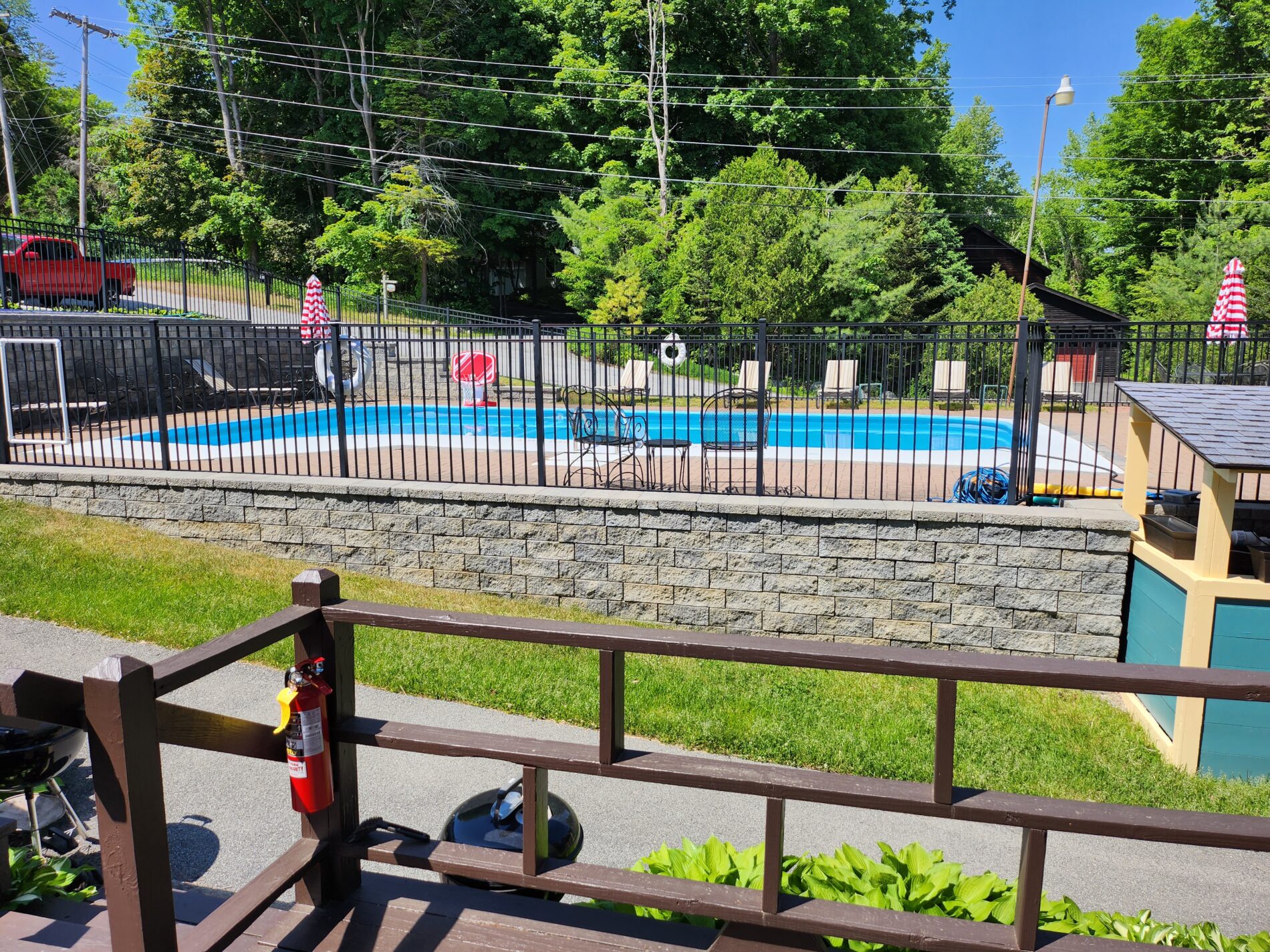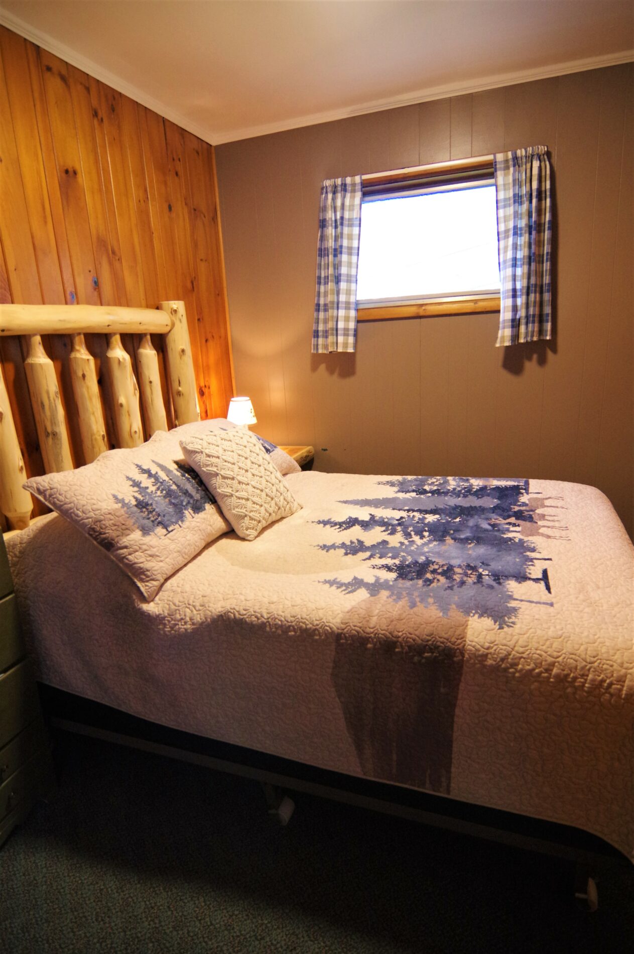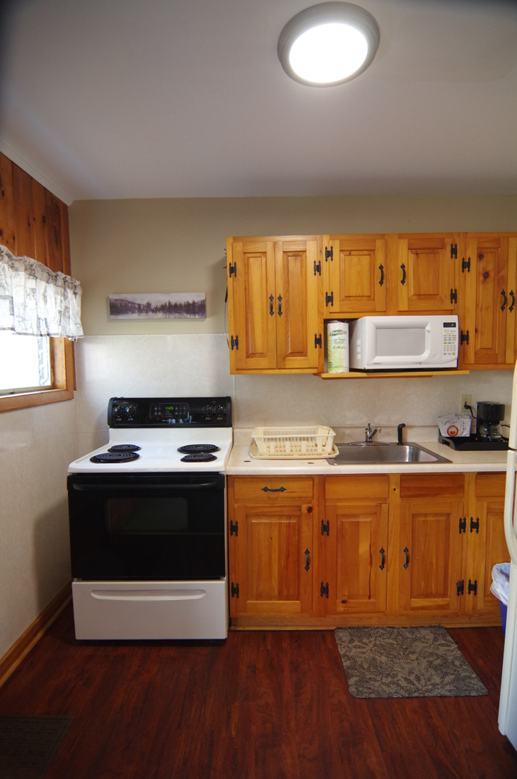 Our most popular duplex two-bedroom, cabin style suite overlooking the north pool that shares a porch with Studio Cottage 18. This Cabin Style Suite has two bedrooms , one with a double bed, the other with a twin over full bunk bed set. The bathroom has a full sized tub with shower. The living room has a futon couch, dining table, sitting area and TV. Full kitchen with a large refrigerator, stove with oven, microwave, and coffee maker. This cabin in Lake George, New York has a sundeck with patio set and grill. This may also be reserved with Studio 18 for groups and families.