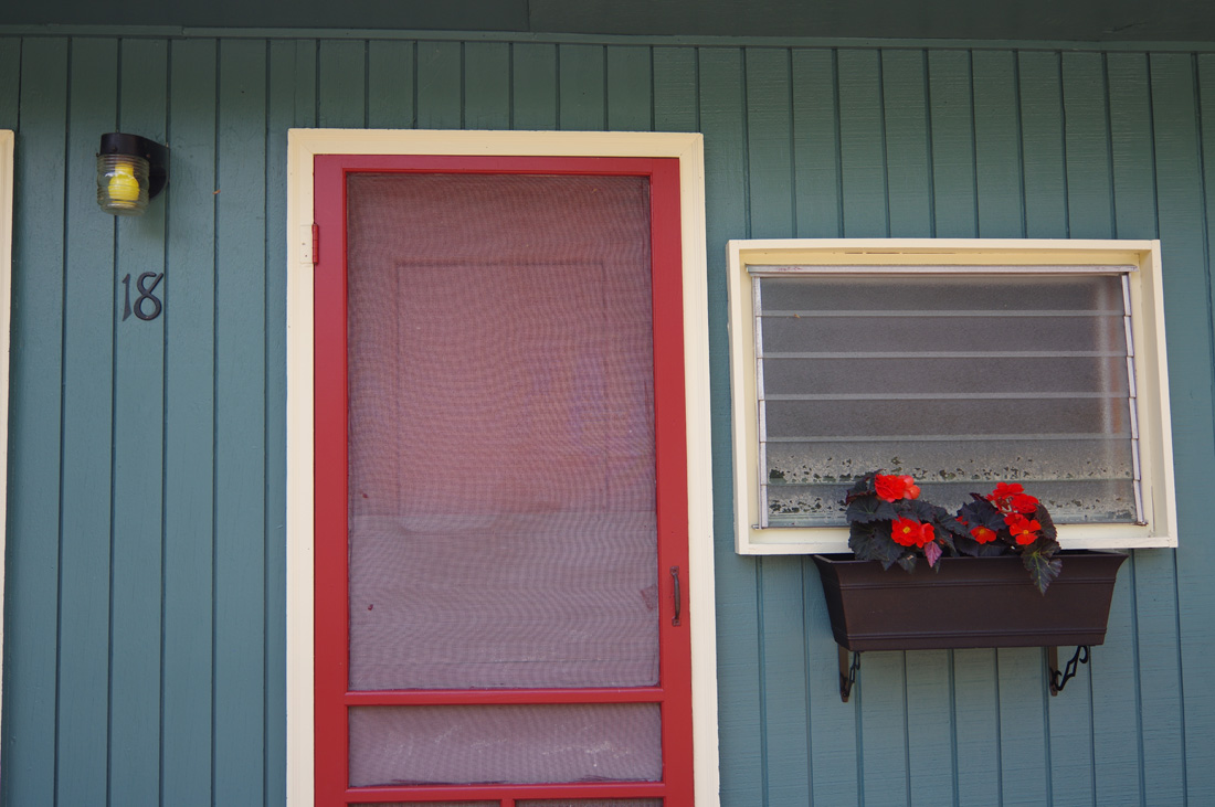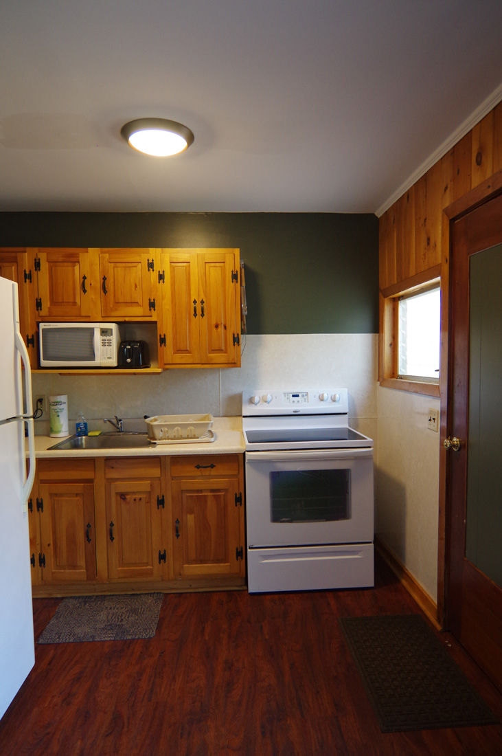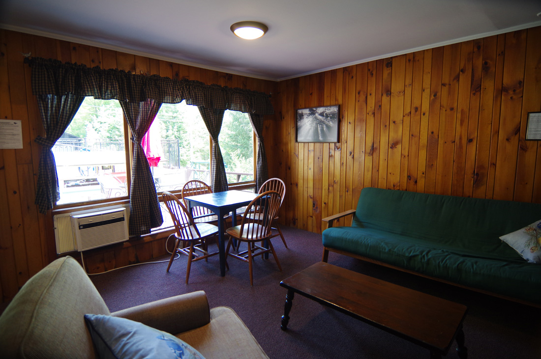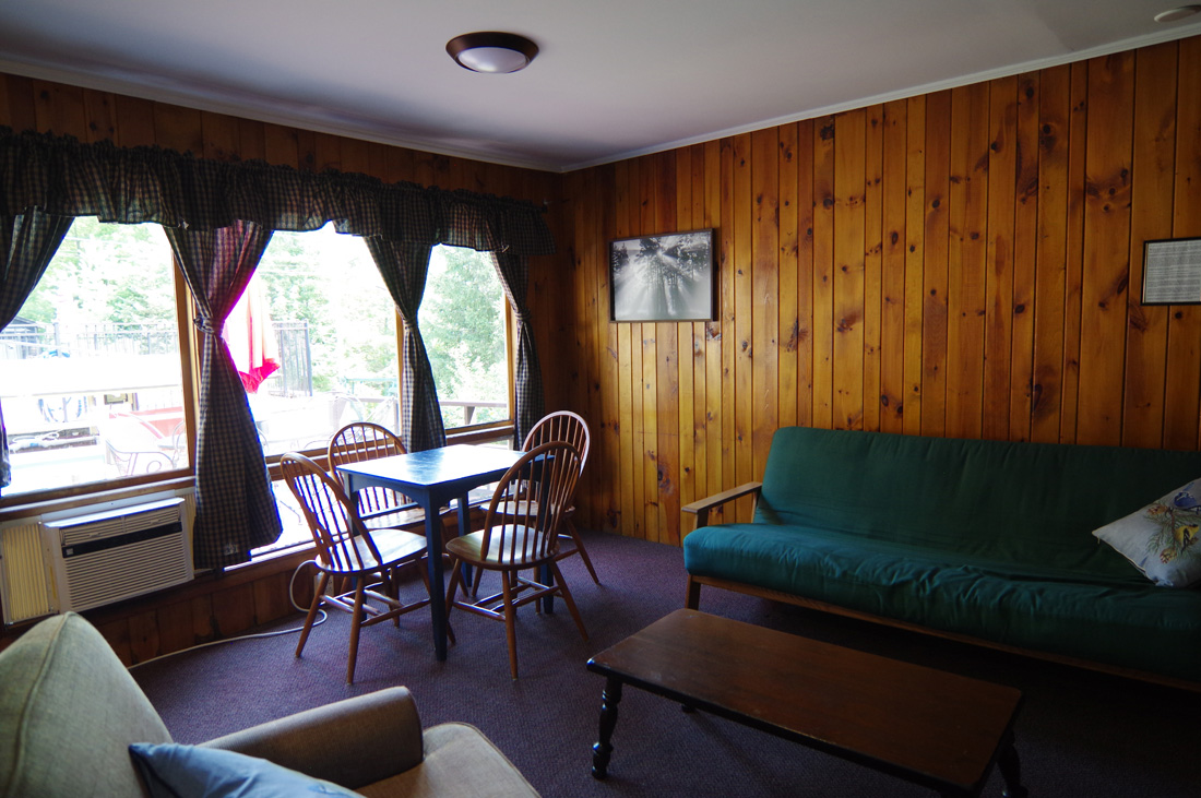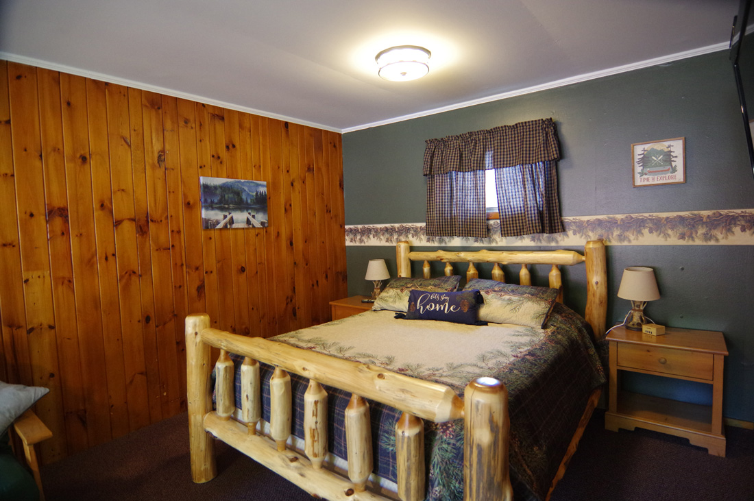 Stylish and cozy studio-style duplex queen suite cabin overlooking the north pool and shares a deck with Cottage 17. This cabin sleeps 2-3, with an authentic cedar log queen-sized bed, a sleeper sofa (best for kids!), a dining table, and a complete kitchen with a large refrigerator, stove with oven, microwave, coffee maker, and stocked with pots, pans, dishware, and utensils. One bath with tub and shower. Private patio set and grill.