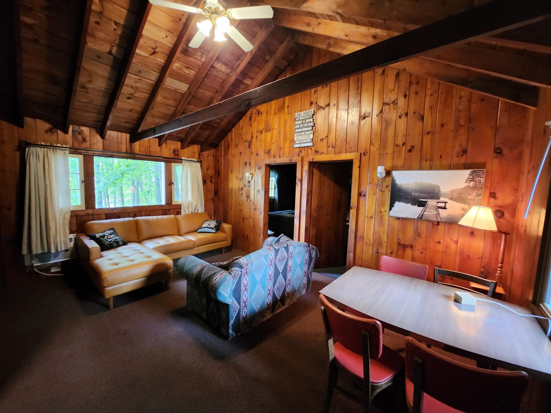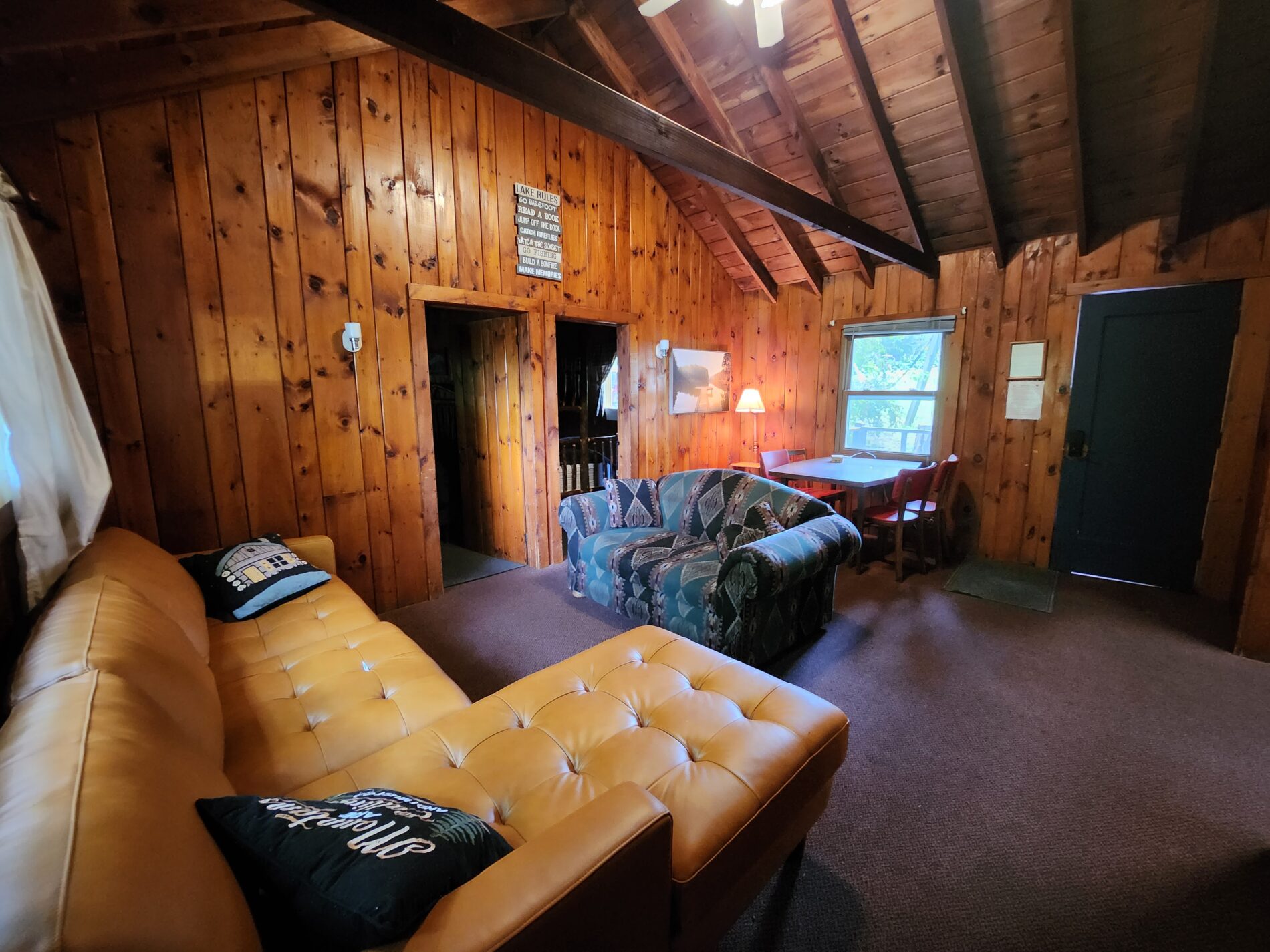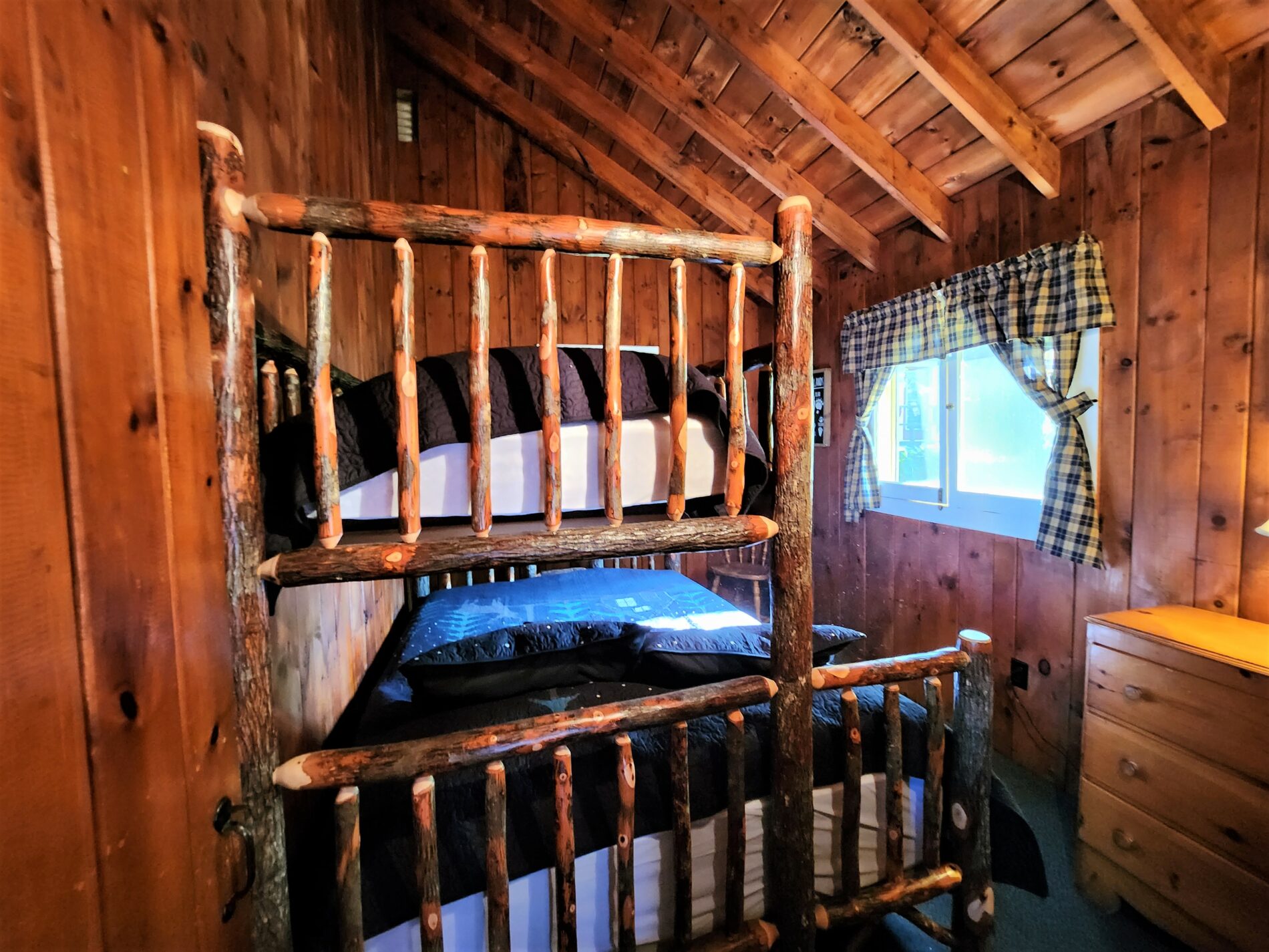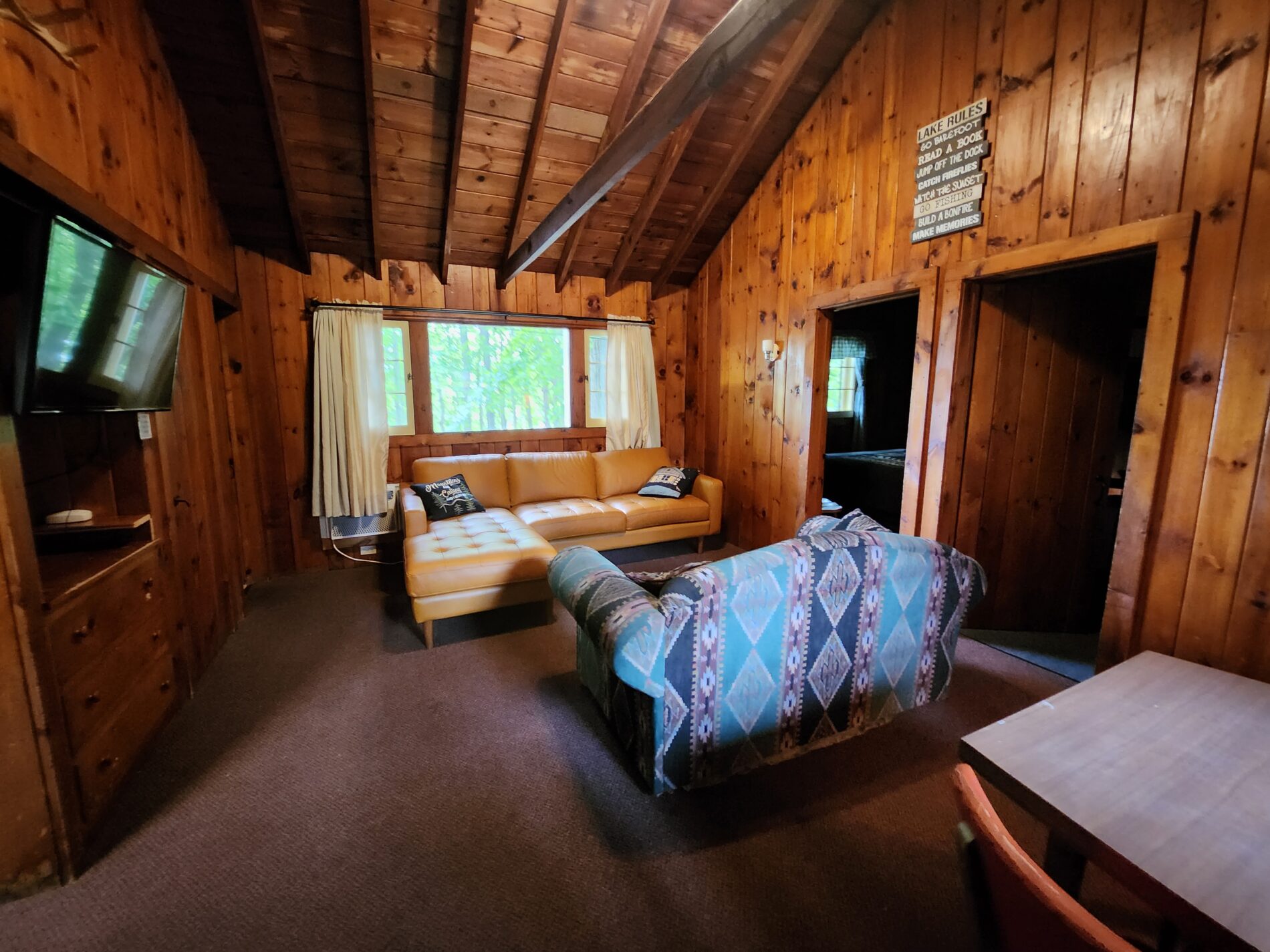 Our most popular cabin rental in Lake George, New York. 2 bedroom, 1 bath cabin is our most popular and spacious two-bedroom traditional and original wood frame cabin. This stand-alone rustic Adirondack-style cottage has its own deck with Solo Fire Stove, relaxing chairs and a patio dining set. Inside is a full kitchen stocked with cooking and dinnerware, and a living room with internet TV< vaulted ceilings, saw-cut beams and pine walls. Ample seating, a large sofa (with a sleeping section best sized for kids!), a love seat, and a dining table. One bedroom has a Hickory log queen bed, the other a twin bunk bed over queen sized bed, sleeps 5-6 including the sofa sleeper. A traditional bathroom offers a stand-up shower. A/C and heat provided by NEW quiet and efficient heat pump mini split units.
