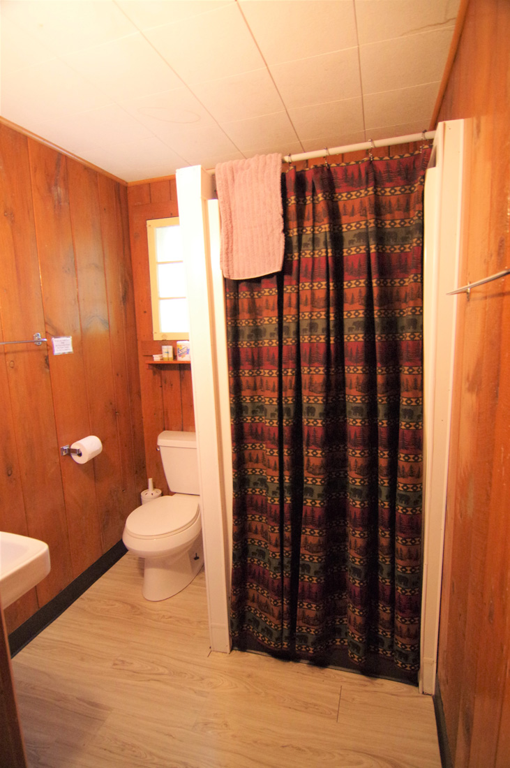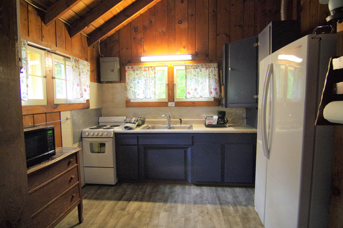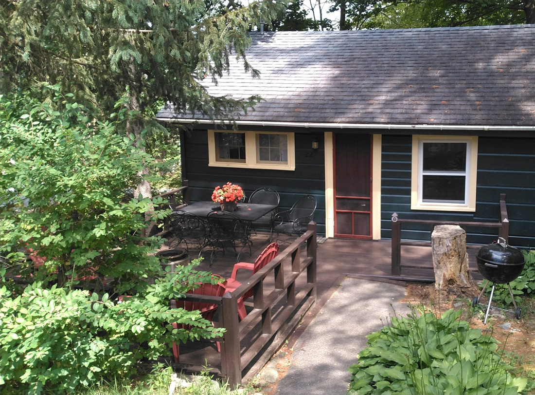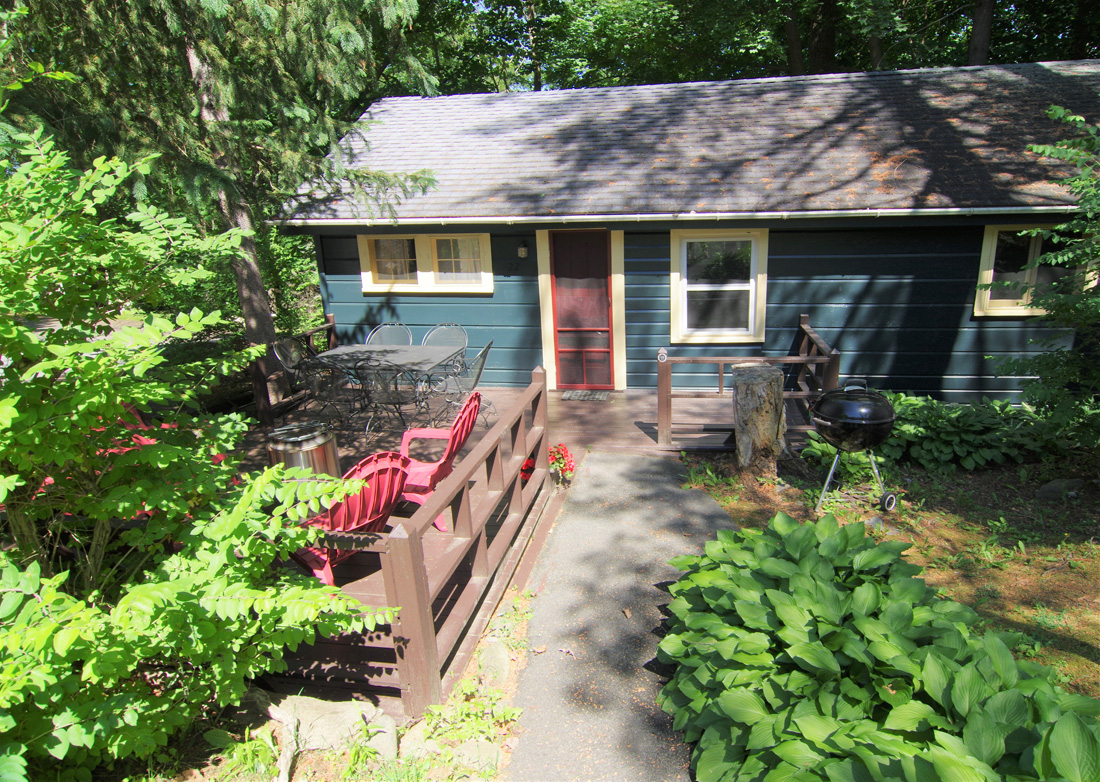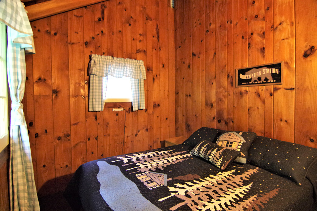 Our most popular cabin rental in Lake George, New York. 2 bedroom, 1 bath cabin is our most popular and spacious two-bedroom traditional and original wood frame cabin. This stand-alone rustic Adirondack-style cottage has its own deck with Solo Fire Stove, relaxing chairs and a patio dining set. Inside is a full kitchen stocked with cooking and dinnerware, and a living room with internet TV< vaulted ceilings, saw-cut beams and pine walls. Ample seating, a large sofa (with a sleeping section best sized for kids!), a love seat, and a dining table. One bedroom has a Hickory log queen bed, the other a twin bunk bed over queen sized bed, sleeps 5-6 including the sofa sleeper. A traditional bathroom offers a stand-up shower. A/C and heat provided by NEW quiet and efficient heat pump mini split units.