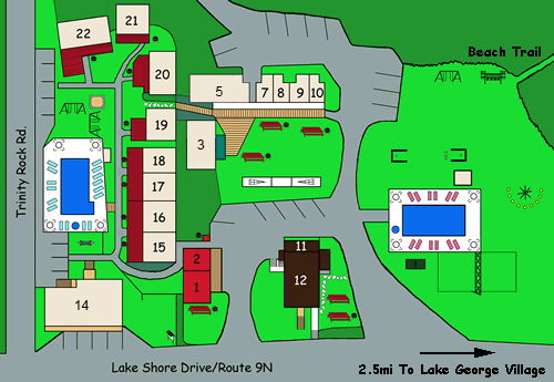 At Cramer’s Point Lake Breeze resort in Lake George, there’s a little something for everyone. Our resort map provides an overview of the many amenities on the property, including our two outdoor pools, picnic areas and grills, swing sets, fire pit and beach trail. Refer to the map when making a reservation to choose your preferred lodging and location.