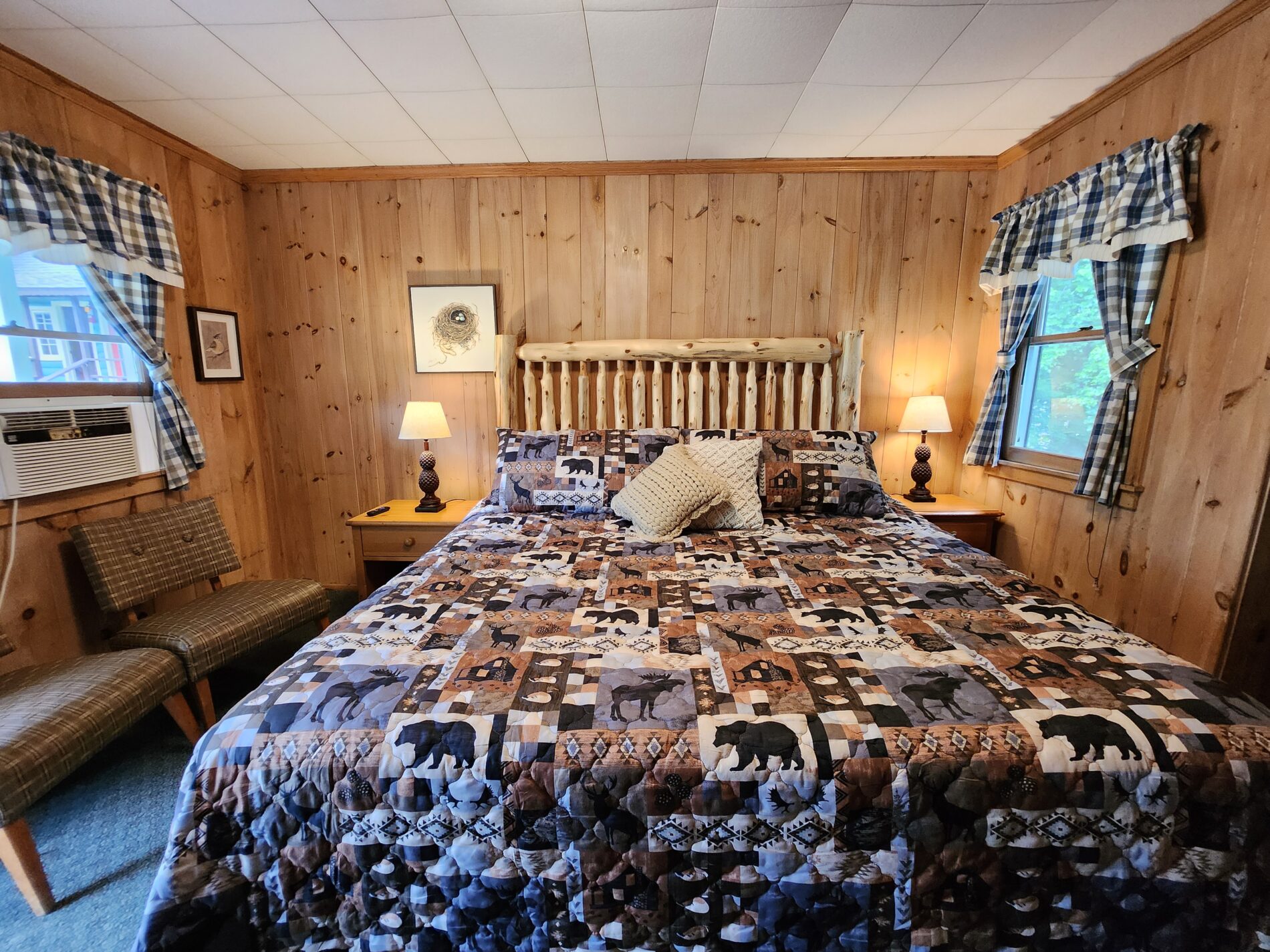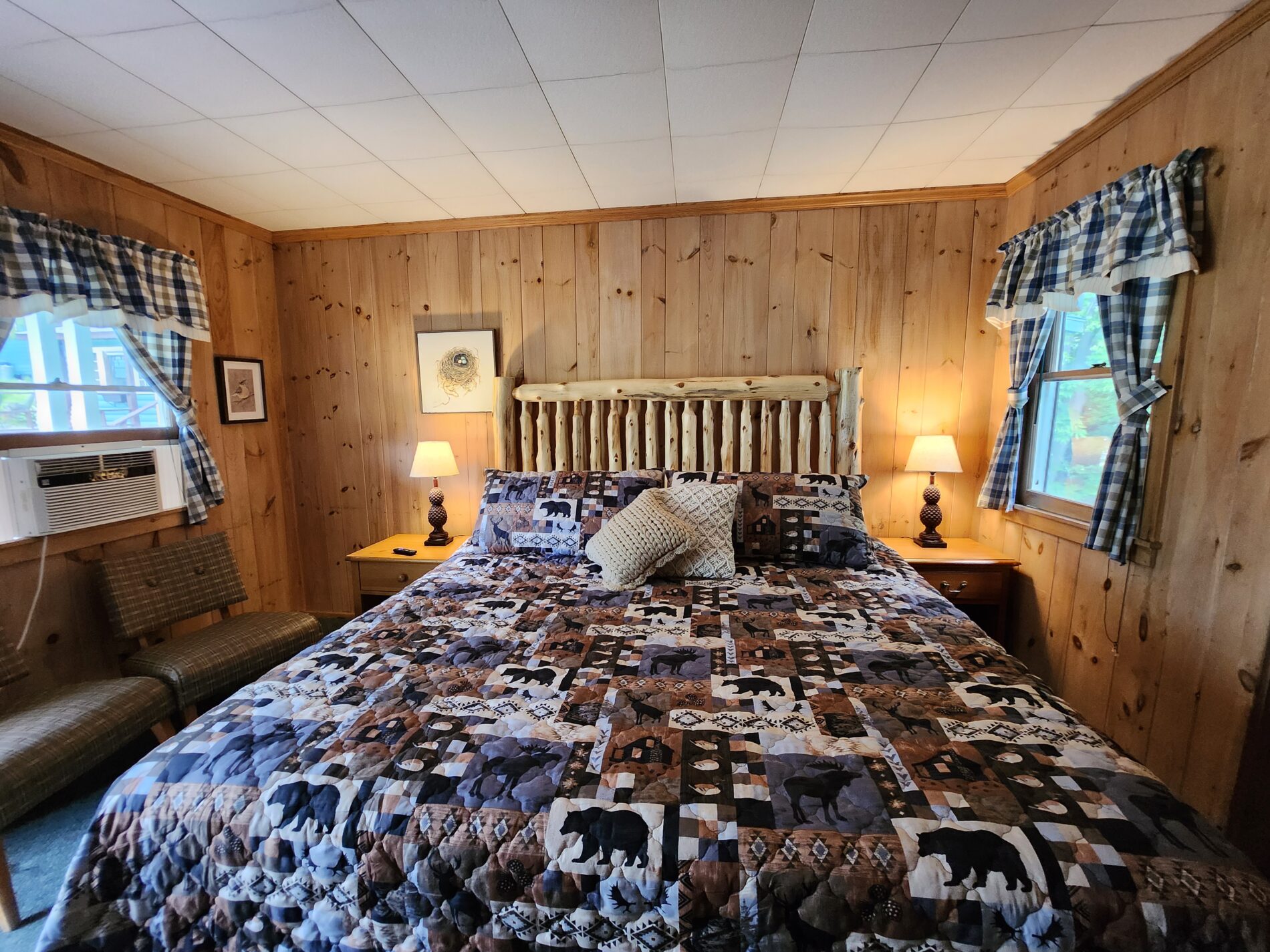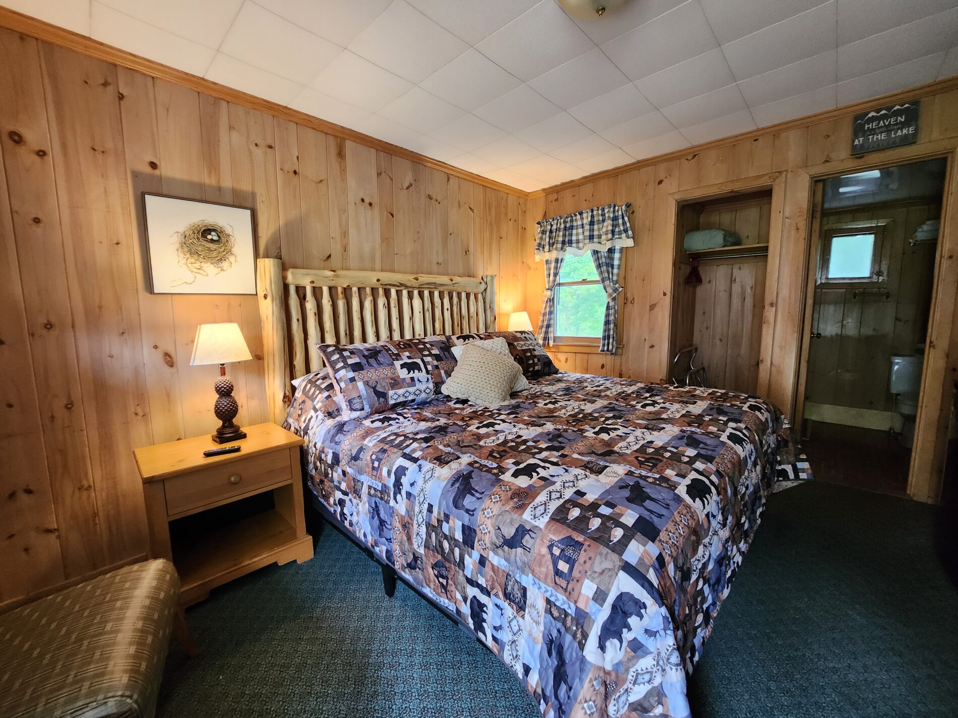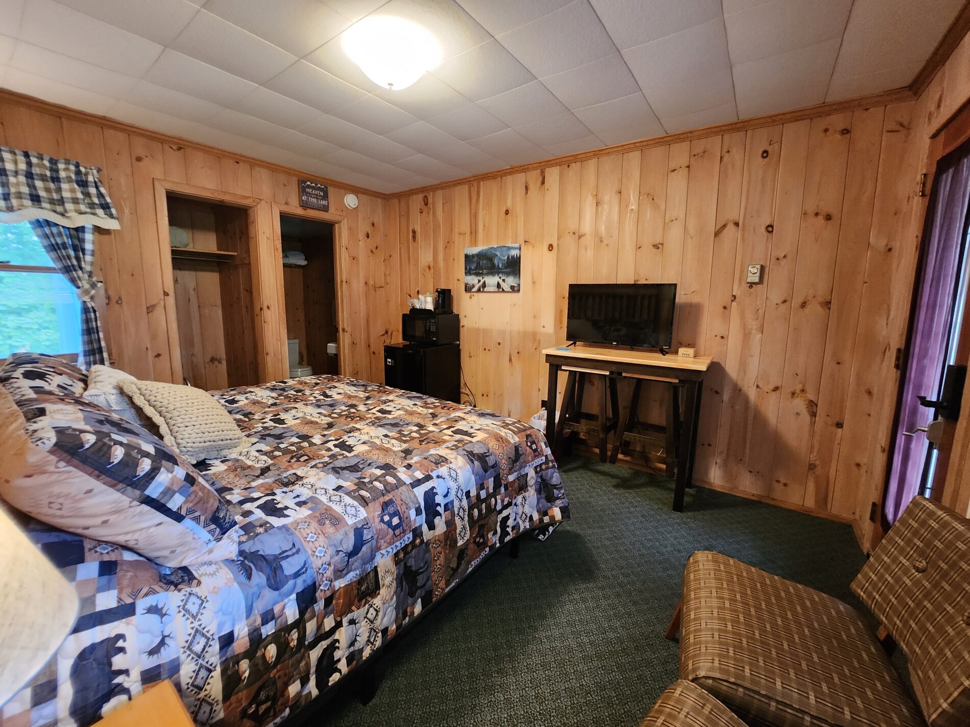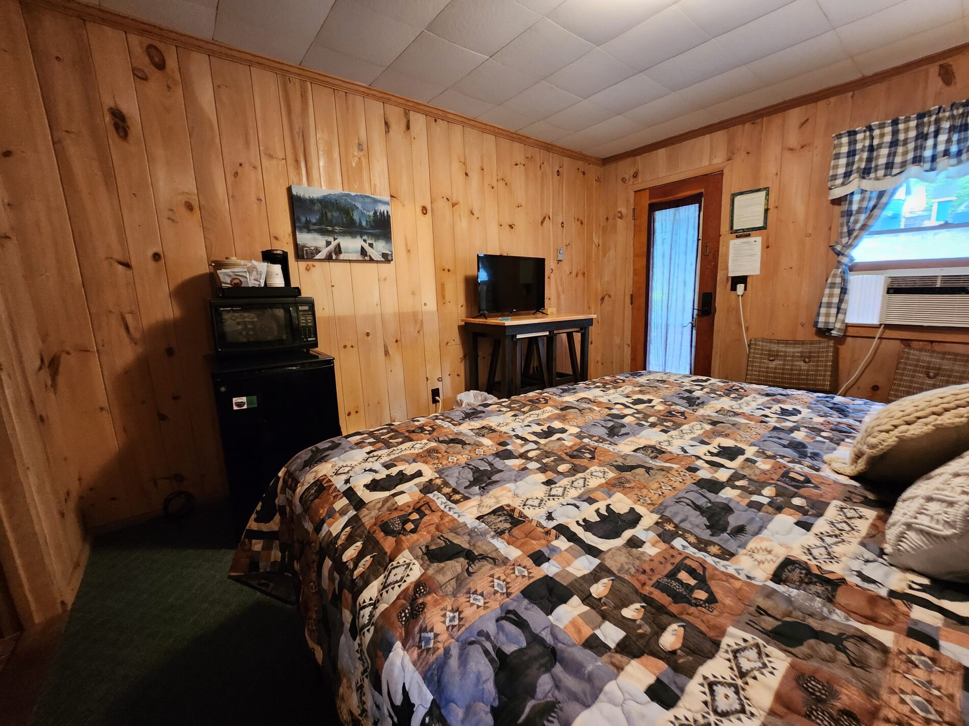 King Room #7 is part of the four plex cabin rental in Lake George, located on the lower part of the property, far from the road, between the north and south pools. This accommodation for two offers a king size bed, 2 person bar top table, mini-fridge, coffee maker and microwave. There is AC, baseboard heat, a flat screen cable TV. The bathroom has a stand-up shower. There is also a covered landing with chairs out front, a picnic table and grill. Guests have access to all resort amenities.