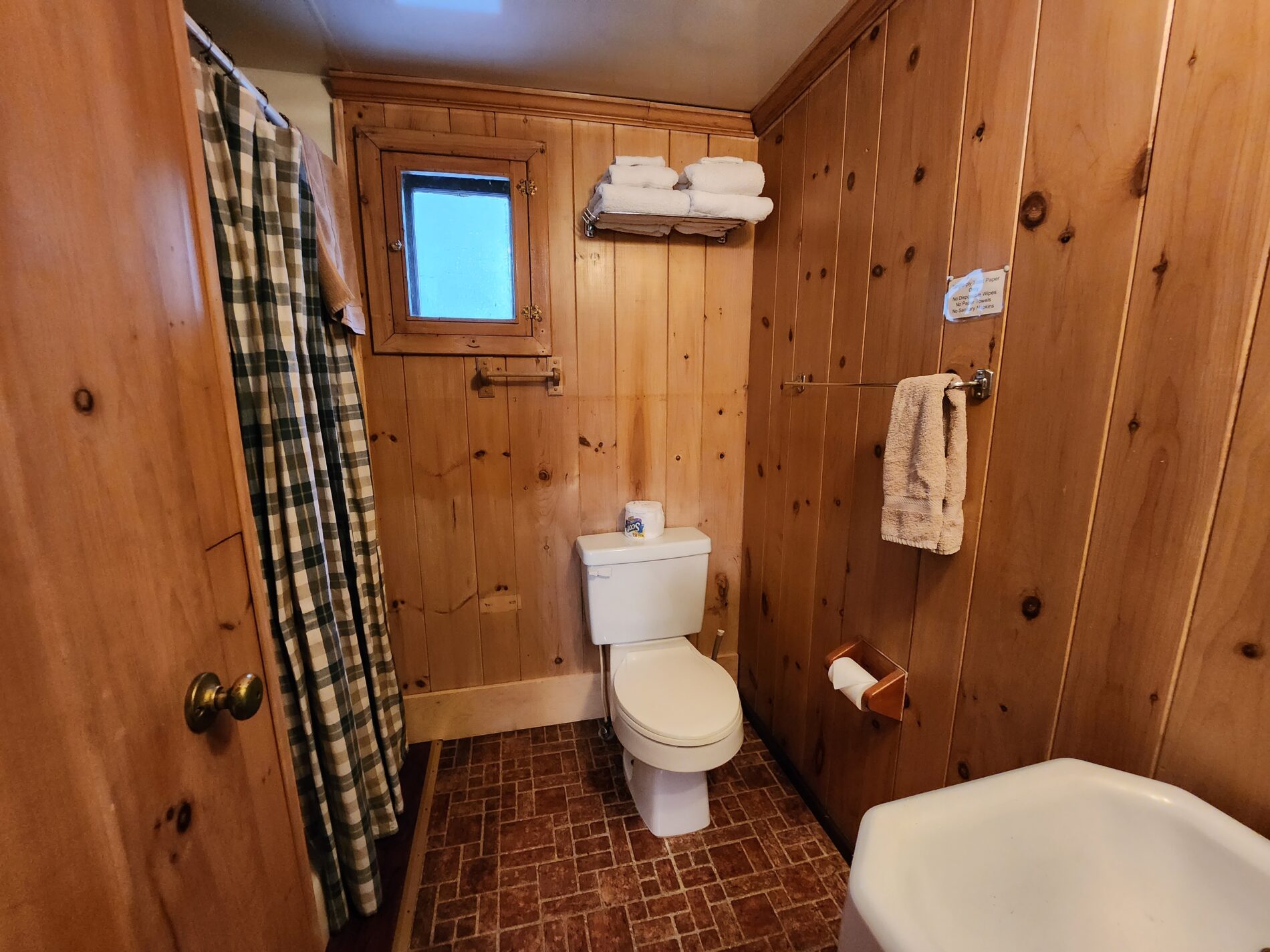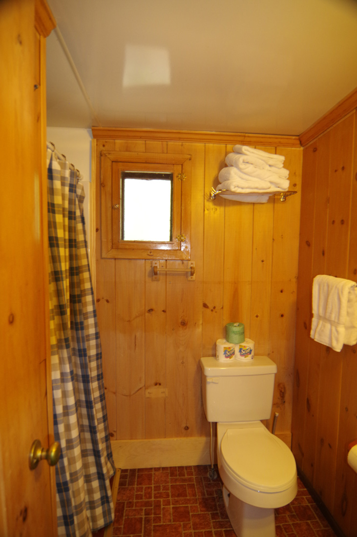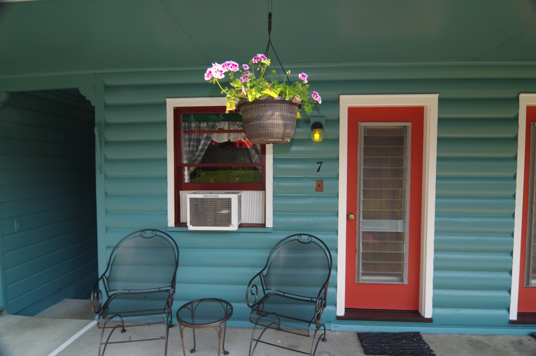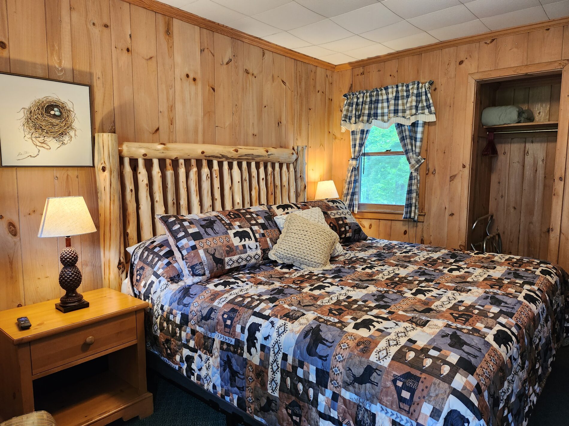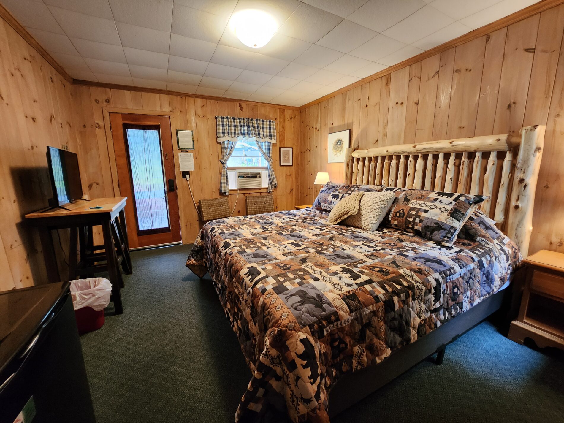 King Room #7 is part of the four plex cabin rental in Lake George, located on the lower part of the property, far from the road, between the north and south pools. This accommodation for two offers a king size bed, 2 person bar top table, mini-fridge, coffee maker and microwave. There is AC, baseboard heat, a flat screen cable TV. The bathroom has a stand-up shower. There is also a covered landing with chairs out front, a picnic table and grill. Guests have access to all resort amenities.
